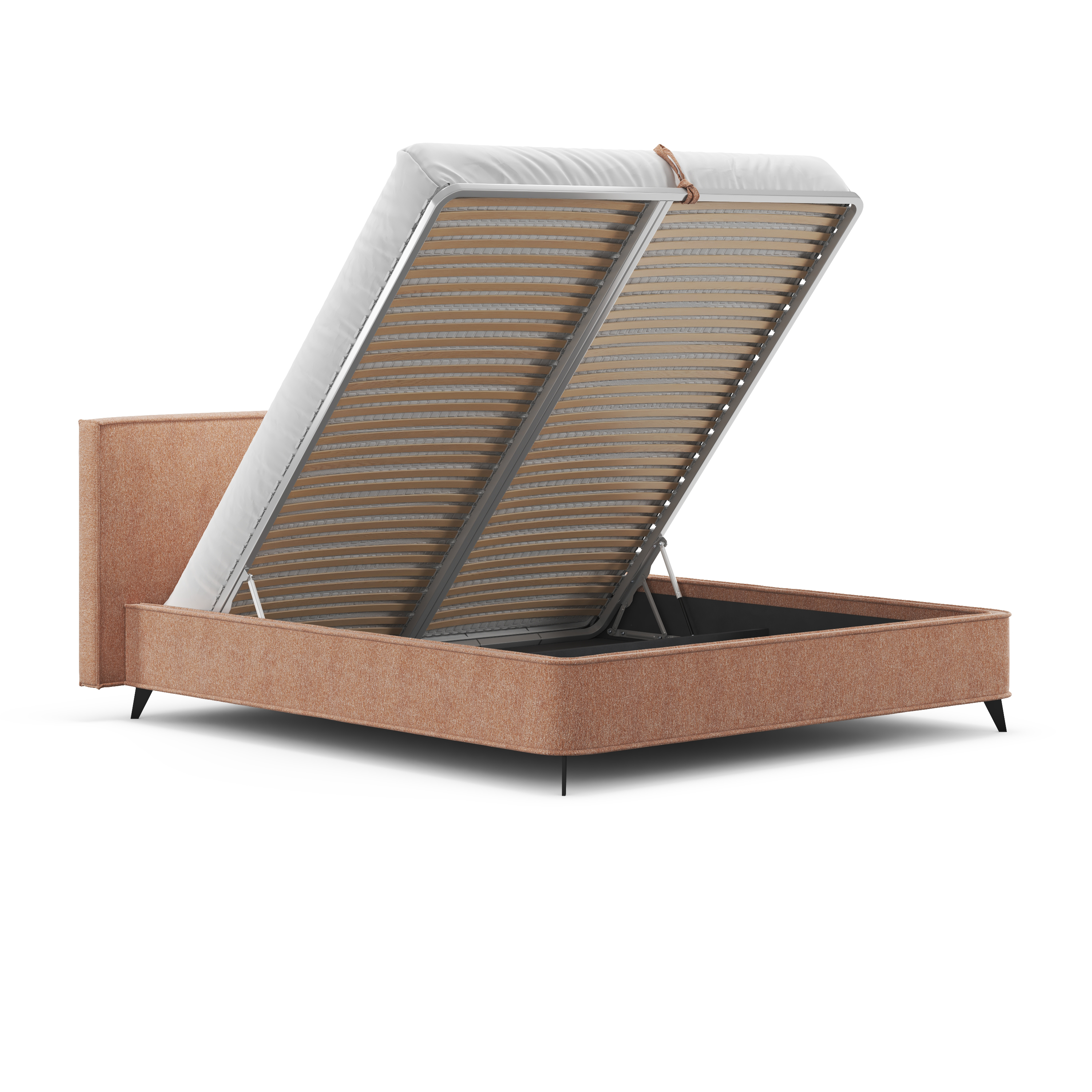 Но главной изюминкой является подъемный механизм, открывающий доступ к вместительному отделению для хранения вещей (оно есть даже в варианте на ножках!). Теперь вы можете рационально использовать пространство спальни и упорядоченно хранить постельное белье и сезонные вещи. Турецкие премиальные амортизаторы подъема обеспечивают плавное и бесшумное открывание и позволяют фиксировать положение в любой точке хода.